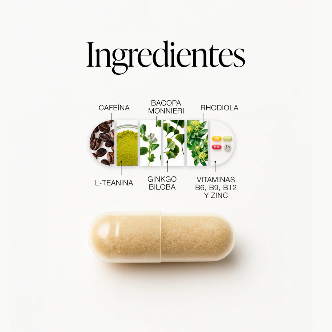Porque ahora incluye una sinergia optimizada de 120 mg de cafeína + 120 mg de L-teanina, con un extra de Bacopa (300 mg), Rhodiola, Ginseng, Ginkgo, y vitaminas B activas. Más eficacia percibida, mejor tolerancia y claridad cuando más lo necesitas.